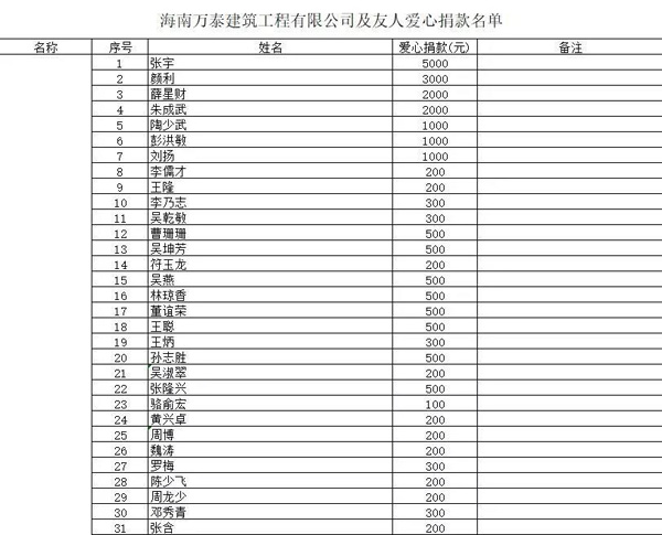 1月28日,我們?cè)诤D先f(wàn)泰建筑公眾號(hào)發(fā)布了海南萬(wàn)泰公司張小龍總經(jīng)理和海口市老年人福利院項(xiàng)目負(fù)責(zé)人林莉共同出資5萬(wàn)元購(gòu)買(mǎi)5000個(gè)N95口罩及飛利浦G31E病人監(jiān)護(hù)儀1套捐贈(zèng)給武穴市及張小龍總經(jīng)理組織同胞募捐的文章《心系荊楚,共渡難關(guān),這場(chǎng)戰(zhàn)“疫”,海南萬(wàn)泰在行動(dòng)!》,在公司引起了極大反響,大家主動(dòng)問(wèn)詢?nèi)绾尉杩顬楹币咔楸M一份力,大家的一腔熱血和愛(ài)心令人動(dòng)容,由此,我們迅速成立萬(wàn)泰籌募組,在公司內(nèi)部展開(kāi)了愛(ài)心捐款。愛(ài)心捐款行動(dòng)一呼百應(yīng),在短短不到兩天的時(shí)間里,萬(wàn)泰募捐組就收到了來(lái)自公司員工,萬(wàn)泰各地項(xiàng)目部及公司的合作友人的支持。截止目前,萬(wàn)泰籌募組已籌得284380元的善款!這些善款,我們已全部捐贈(zèng)給武穴市梅川鎮(zhèn)政府用于抗擊湖北疫情。捐款情況已向海南省湖北商會(huì),武穴市工商聯(lián),武穴市統(tǒng)戰(zhàn)部匯報(bào)。后續(xù)我們將跟蹤款項(xiàng)用途。