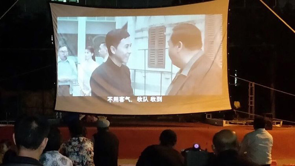 鄉(xiāng)親們齊聚一堂,觀看愛國電影
