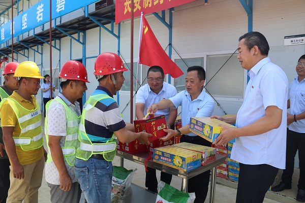 揭牌儀式結(jié)束后,結(jié)合“送清涼,戰(zhàn)酷暑”省建設(shè)工會(huì)在行動(dòng),傅愛萍副書記與長安制藥黨支部書記汪立冬、萬泰工會(huì)主席顏利代表省建設(shè)工會(huì)和海南萬泰工會(huì)為項(xiàng)目工友送上了一份份防暑降溫慰問品,為辛勤堅(jiān)守在一線工作崗位上的勞動(dòng)者帶來絲絲“清涼”,也表達(dá)了對一線職工的關(guān)懷。