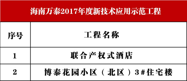 近日,海南省住房和城鄉(xiāng)建設(shè)廳發(fā)布公告,公布了2017年度海南省建筑業(yè)新技術(shù)應(yīng)用示范工程立項(xiàng)評(píng)審結(jié)果,共計(jì)24項(xiàng)工程獲評(píng)新技術(shù)示范工程。其中,海南萬(wàn)泰建筑住工程有限公司承建的“聯(lián)合產(chǎn)權(quán)式酒店“和”博泰花園小區(qū)(北區(qū))3#住宅樓“兩個(gè)項(xiàng)目名列榜單。