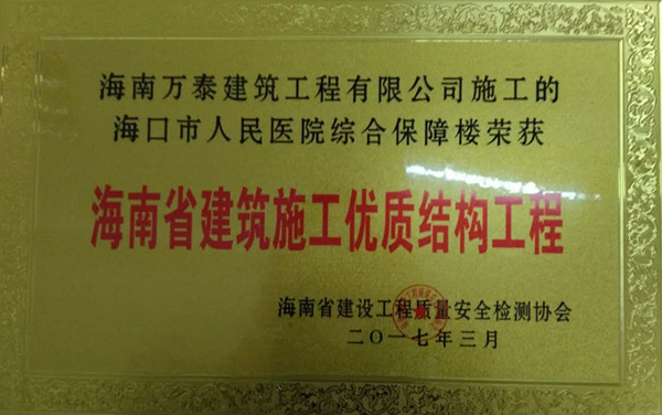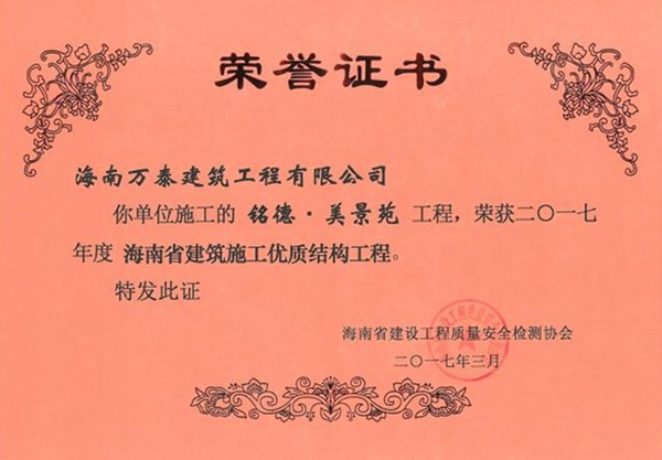 2017年6月20日,經(jīng)過了長期的嚴(yán)格評審之后,由海南萬泰承建的??谑腥嗣襻t(yī)院綜合保障樓、瓊海信達(dá)銀海御湖(一期)、銘德.美景苑三個項目全部通過基礎(chǔ)、主體階段的評審,并榮獲海南省建設(shè)工程質(zhì)量安全檢測協(xié)會頒發(fā)的《海南省建筑施工優(yōu)質(zhì)結(jié)構(gòu)工程》證書。至此,繼“藍(lán)城商務(wù)大廈 ”榮獲“椰城杯”后,萬泰工程再斬殊榮。值得一提的是,這已經(jīng)是萬泰本年度第三次榮獲相關(guān)獎項。