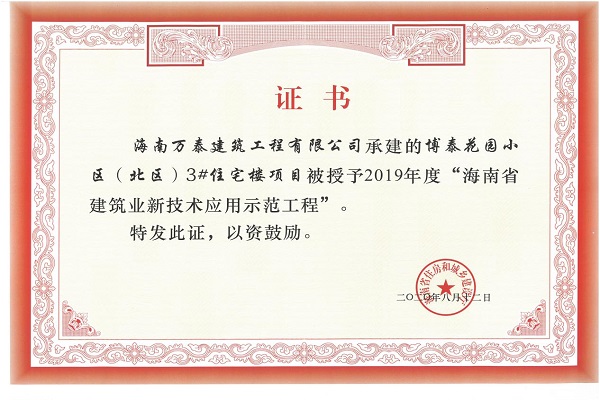 近日,從海南省住房和城鄉(xiāng)建設(shè)廳傳來喜訊,由海南萬泰建筑工程有限公司承建的“博泰花園小區(qū)(北區(qū))3#住宅樓項(xiàng)目”和“聯(lián)合產(chǎn)權(quán)酒店項(xiàng)目”榮獲2019年度“海南省建筑業(yè)新技術(shù)應(yīng)用示范工程”。