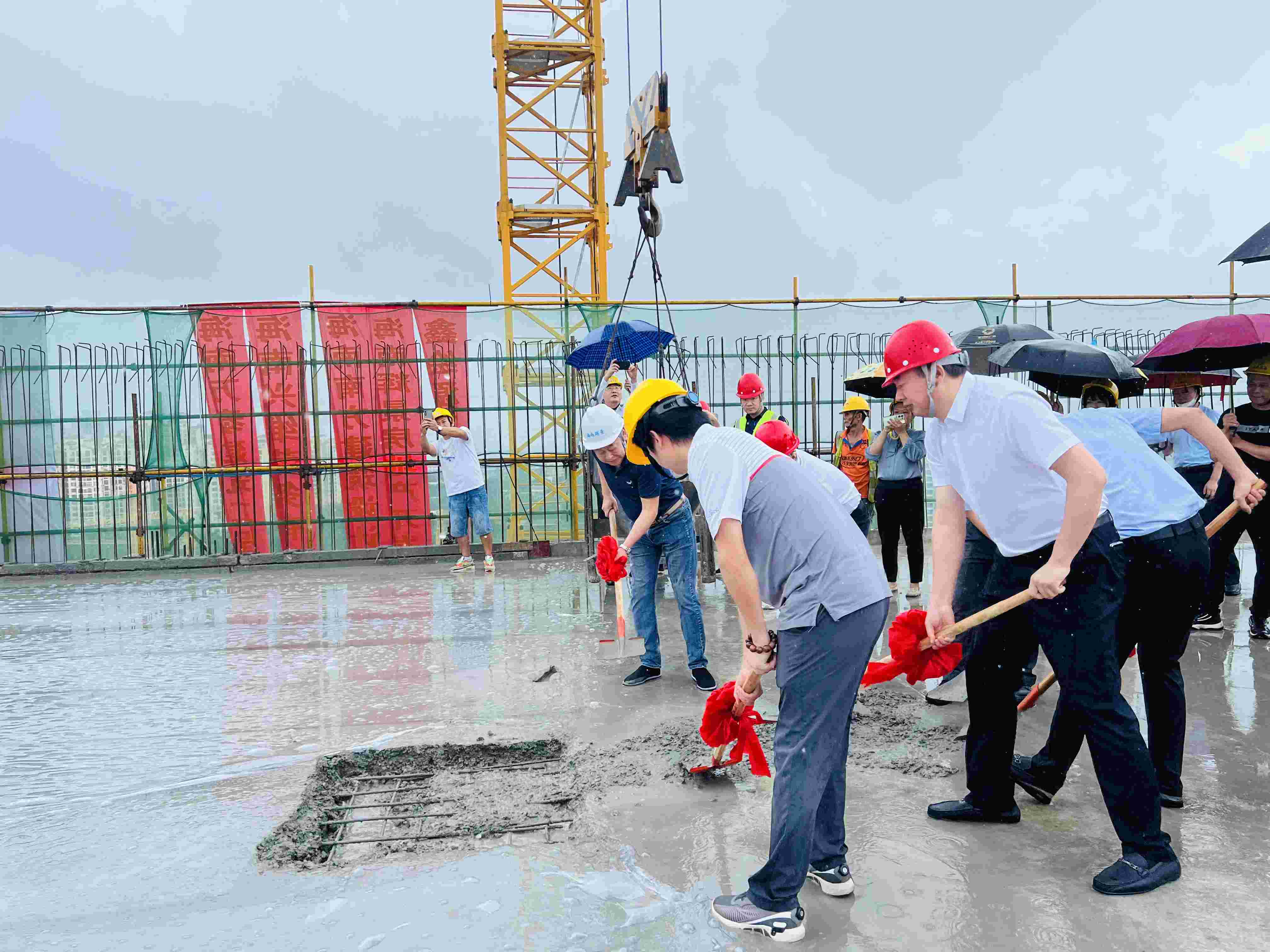 大家在做好安全防護(hù)措施后一起走上了頂樓,伴隨著禮花的炮鳴聲,共同為項(xiàng)目主體結(jié)構(gòu)的最后一塊區(qū)域澆筑混凝土。隨后,海南萬泰公司顏利總正式宣布項(xiàng)目主體結(jié)構(gòu)封頂成功。