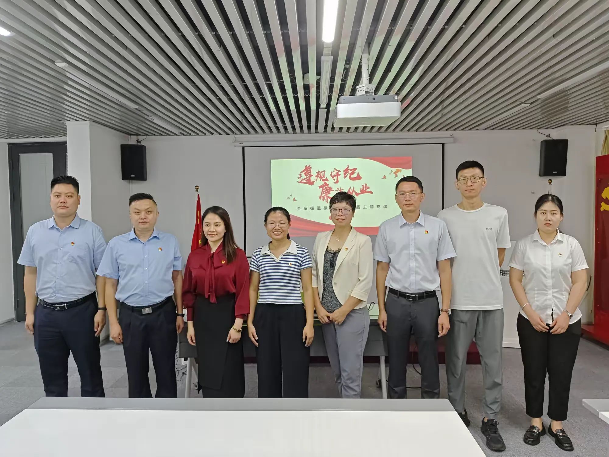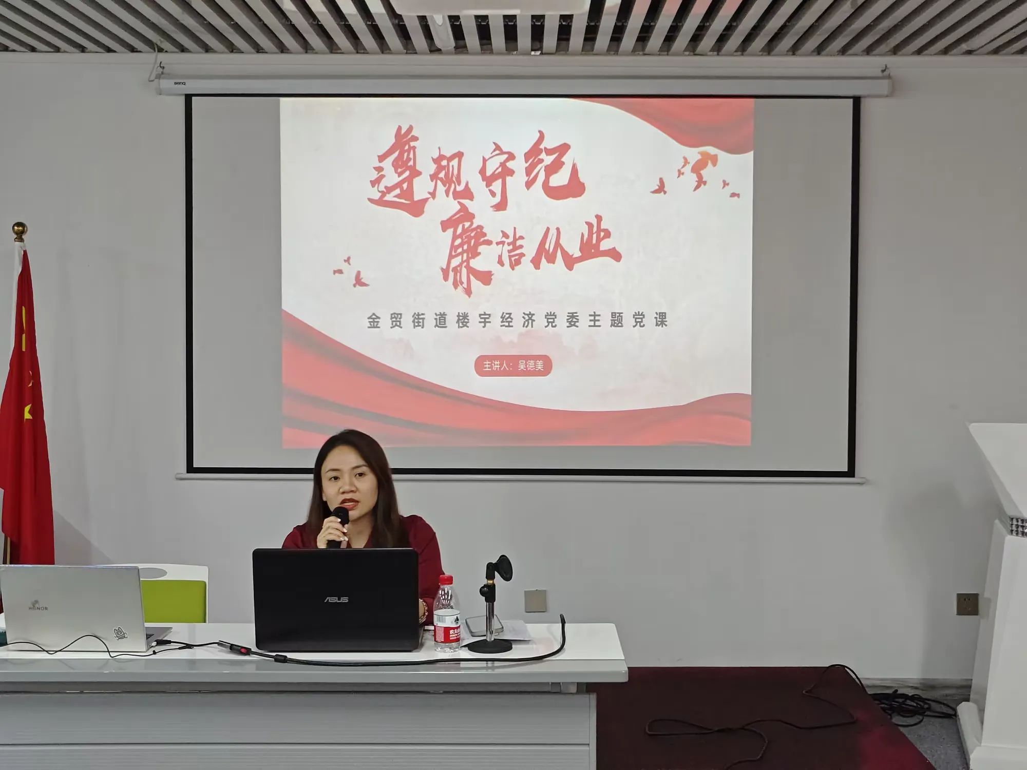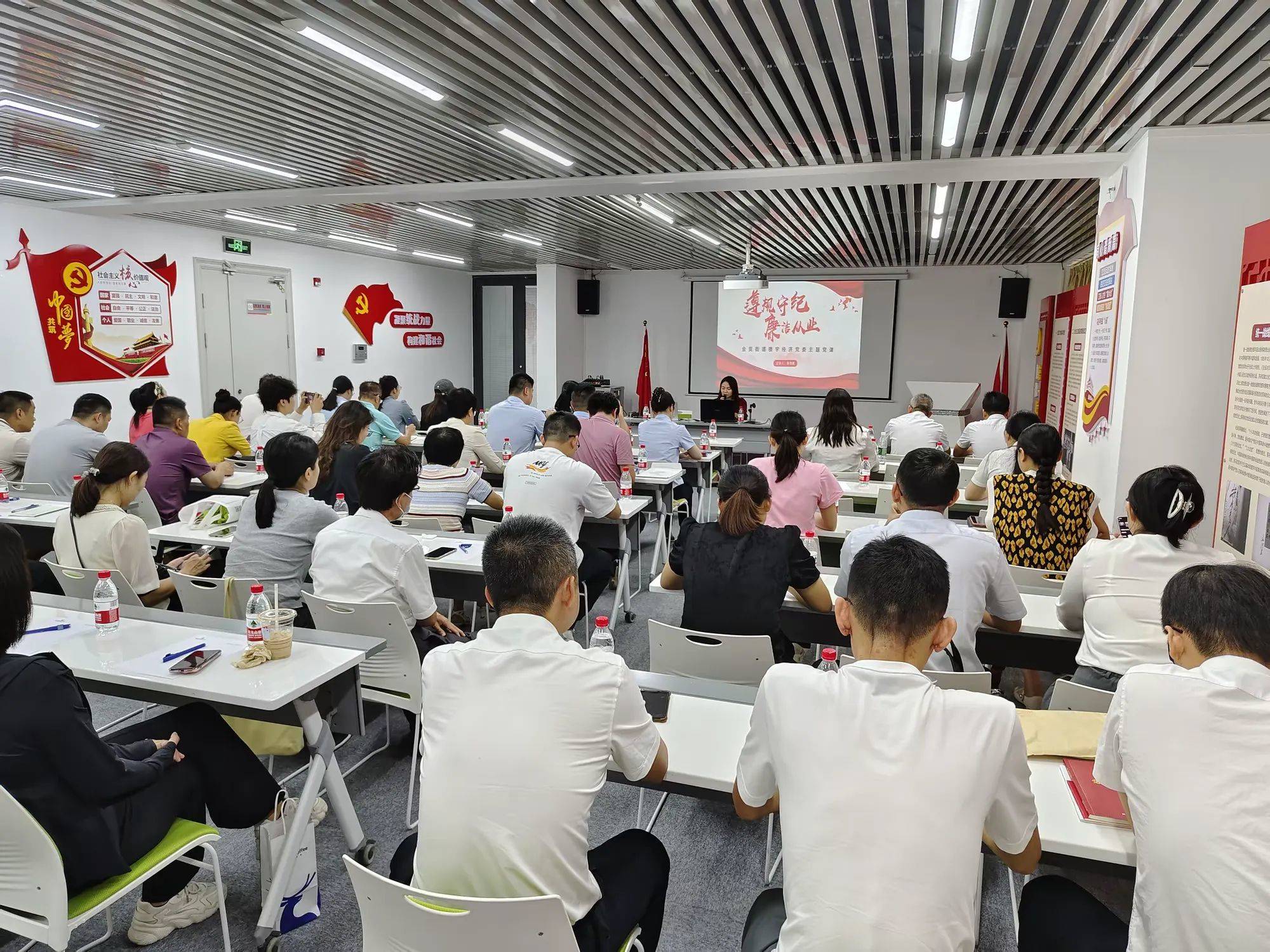 活動中,金貿(mào)街道樓宇經(jīng)濟黨委書記吳德美以“遵規(guī)守紀 廉潔從業(yè)”為主題為大家講授了一堂深刻的黨課,從廉潔從業(yè)的有關(guān)規(guī)定、意義、企業(yè)關(guān)鍵崗位廉潔風險點及防控措施、警示案例等多方面強調(diào)了廉潔從業(yè)的重要性。