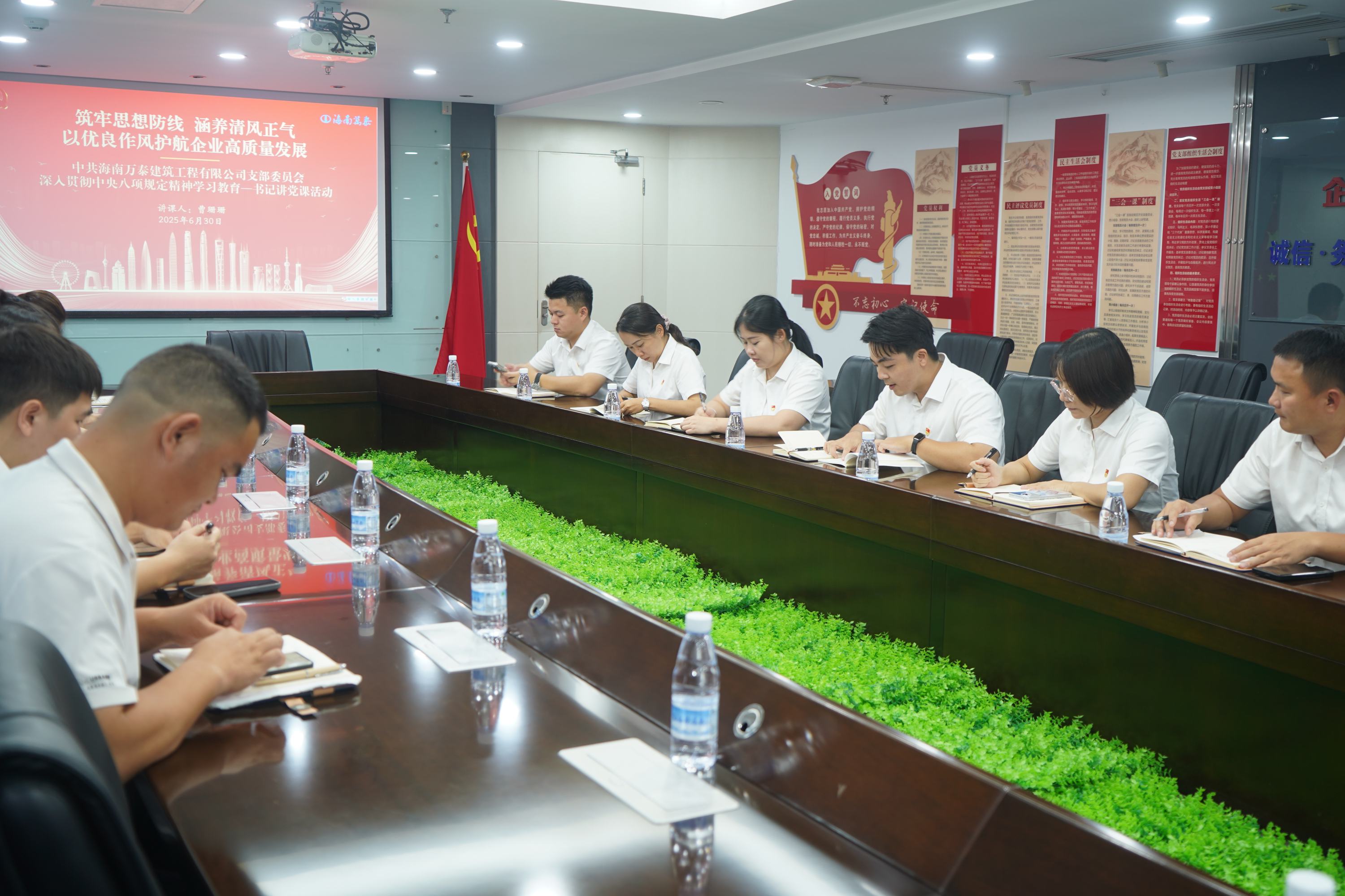 為深入貫徹中央八項(xiàng)規(guī)定精神學(xué)習(xí)教育,引導(dǎo)黨員干部學(xué)深悟透,6 月 30 日下午,海南萬(wàn)泰公司黨支部在黨建會(huì)議室組織開(kāi)展了深入貫徹中央八項(xiàng)規(guī)定精神學(xué)習(xí)教育暨書(shū)記講黨課活動(dòng)。本次會(huì)議由黨支部書(shū)記曹珊珊主持,旨在進(jìn)一步強(qiáng)化黨員干部的作風(fēng)建設(shè),推動(dòng)公司高質(zhì)量發(fā)展。支部黨員及入黨積極分子參加了本次活動(dòng)。