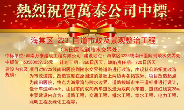 熱烈祝賀海南萬泰中標海棠區(qū)223國道市政及景觀整治工程南田醫(yī)院到陵水交界處項目