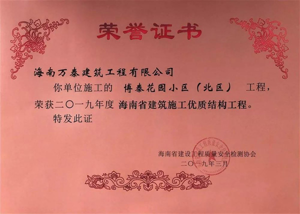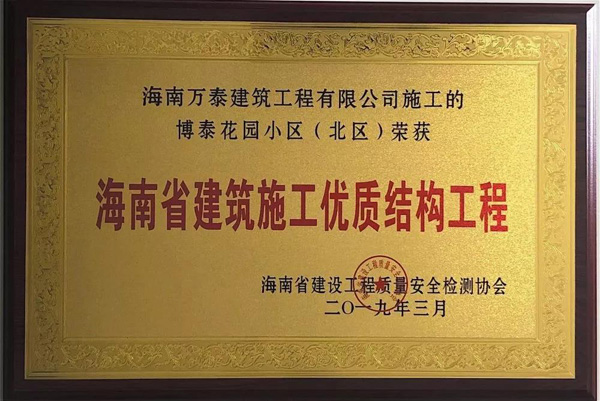 博泰花園小區(qū)(北區(qū))“海南省建筑施工優(yōu)質結構”獎