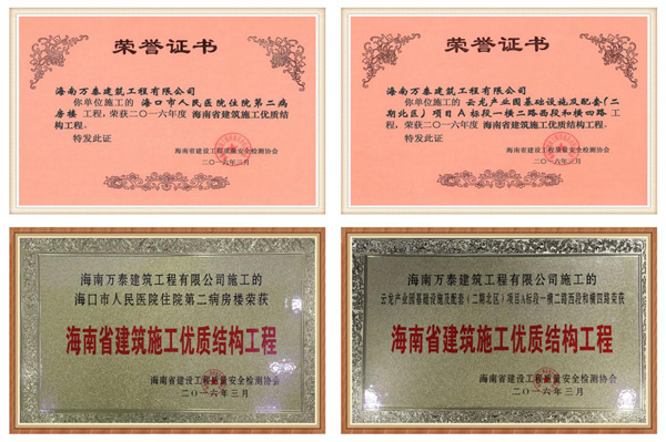 2016年3月,由海南萬泰建筑工程有限公司承建的“??谑腥嗣襻t(yī)院住院第二病房樓”及“云龍產(chǎn)業(yè)園基礎(chǔ)設(shè)施及配套(二期)項目”工程被海南省建設(shè)工程質(zhì)量安全檢測協(xié)會評為《海南省建筑施工優(yōu)質(zhì)結(jié)構(gòu)工程》榮譽稱號。