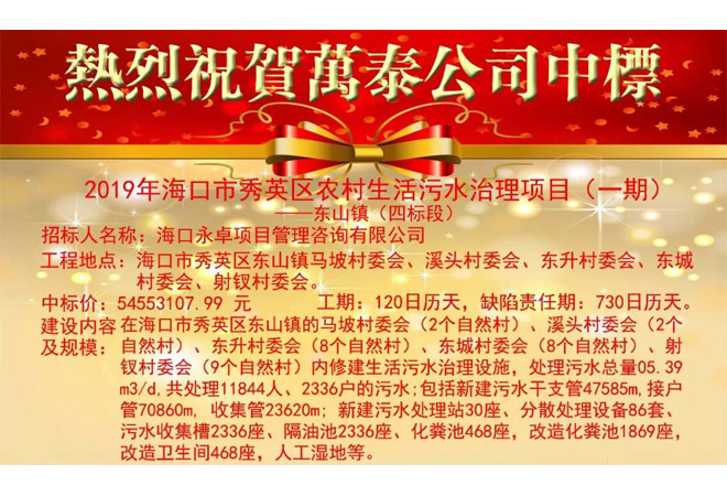熱烈祝賀海南萬泰中標(biāo)2019年??谑行阌^(qū)農(nóng)村生活污水治理項目(一期)-東山鎮(zhèn)(四標(biāo)段)